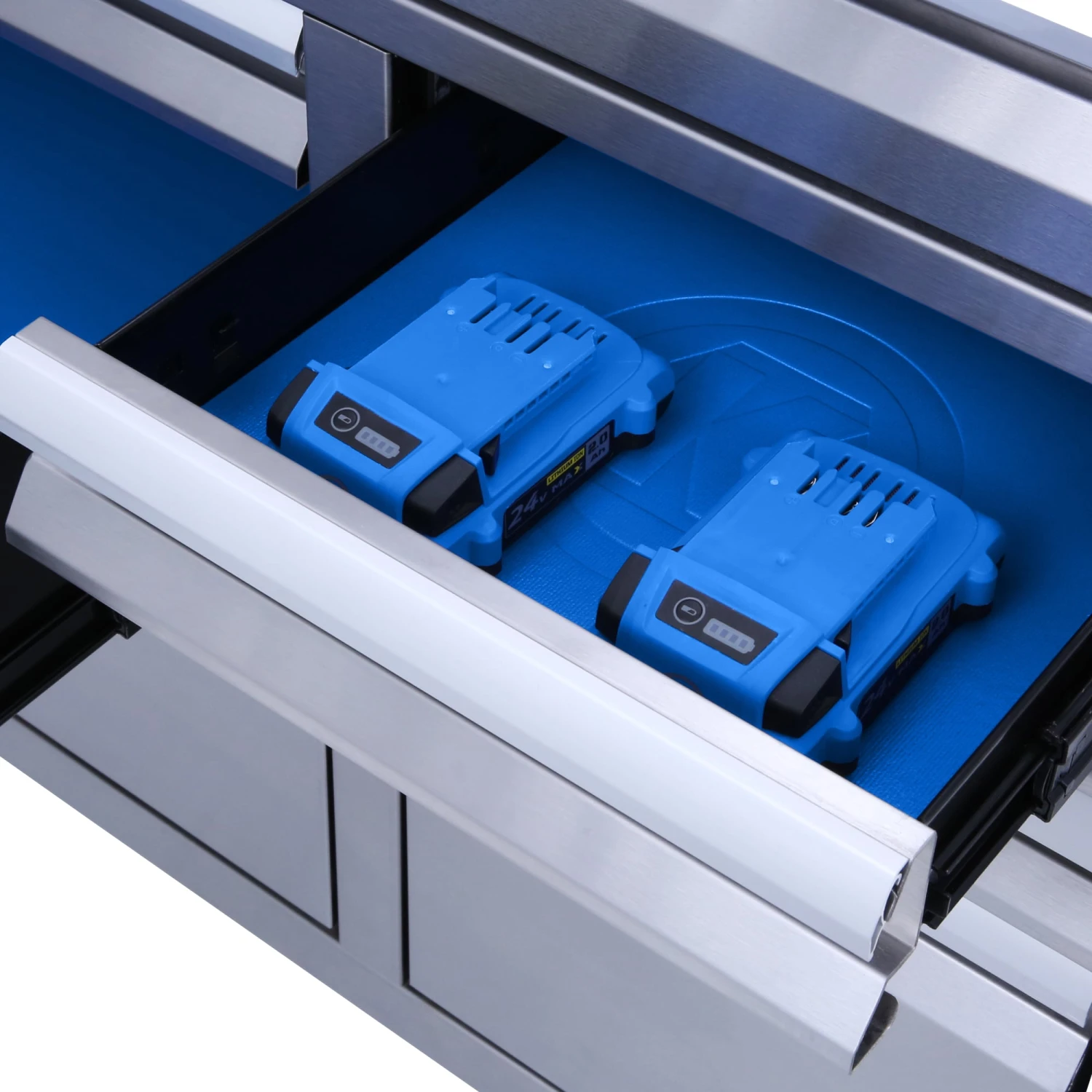 This Kobalt 3000 series heavy duty mobile workbench is ready to serve. With over 17,000 cu. inches of storage and a 2000 lb. load capacity, this mobile cabinet is built to last. This cabinet has heavy duty, ball bearing drawer glides for smooth functionality when fully loaded. Couple this with their soft close feature and you don’t have to worry about the drawers opening or slamming closed when you are moving around. Coordinating custom fitted drawer liners protect your tools from scratching or rolling around. This box is built tough with double walled construction and heavy duty, industrial strength casters that can hold up to 2000 lbs. and continue to roll smoothly. Built in power supply with USB ports is included to allow you to charge power tools and electronics. Recessed side handles allow for maneuverability and storage in tight spaces.