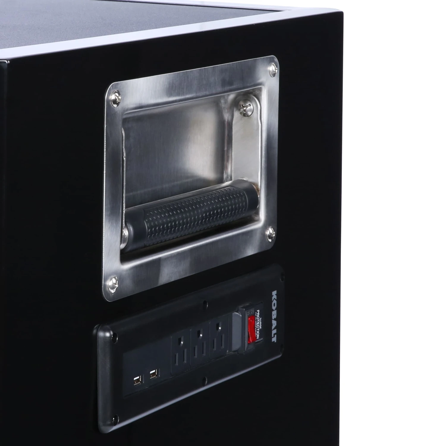 This Kobalt 3000 series heavy duty mobile cabinet is ready to serve. With over 17,000 cu inches of storage and a 2000 lb. capacity, this mobile cabinet is built to last. This cabinet has heavy duty, ball bearing drawer glides for smooth functionality when fully loaded. Couple this with their soft close feature and you don’t have to worry about the drawers opening or slamming closed when you are moving around. Coordinating custom fitted drawer liners protect your tools from scratching or rolling around. This box is built tough with double walled construction and heavy duty, industrial strength casters that can hold up to 2000 lbs and continue to roll smoothly. Integrated power supply with USB ports for charging electronics and power tools.