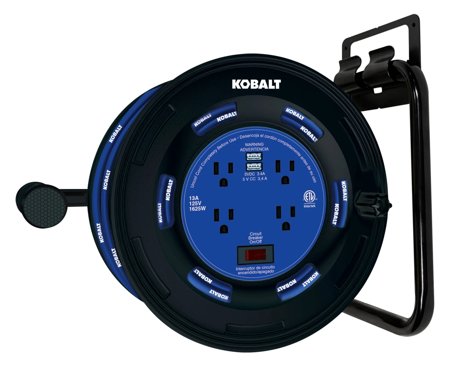 4-Outlet KOBALT black/blue cord reel 2-USB w/80ft 14/3 SJTW ext cord.