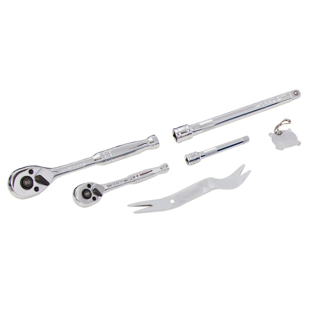 - Additional tools include a 6-inch extension and 3/8-inch drive universal joint adapter