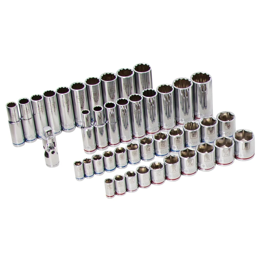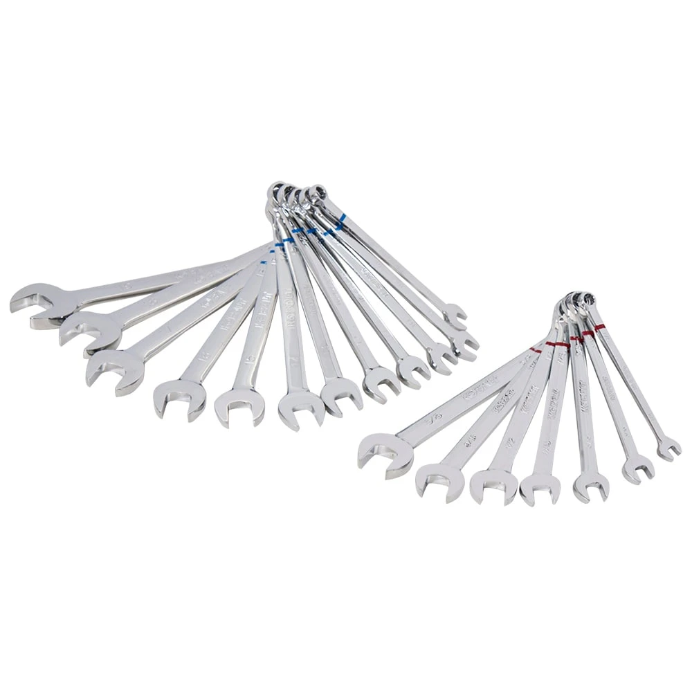 - Sockets and wrenches have a color coded stripe and clear size callouts, making it easy to identify metric and SAE sizes with a quick glance