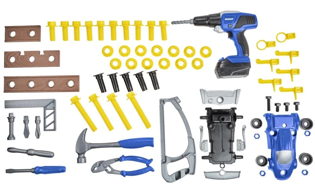 Hours of fun for your child contained in one case! Our toy Kobalt™ Work Bench and Tool Set is 54 pieces of childhood delight. Unassembled, the entire set folds into one carrying case. When assembled, your little carpenter has his own workbench and numerous accessories for hours of building and imaginative fun. This toy tool set includes a power drill with three bits, a hack saw, a hammer, a screwdriver with two exchangeable heads, a pair of pliers, a square ruler, and a take-apart race car… plus more! For ages 3 years and up. Collect all six special holiday Kobalt™ toys for a complete set!
