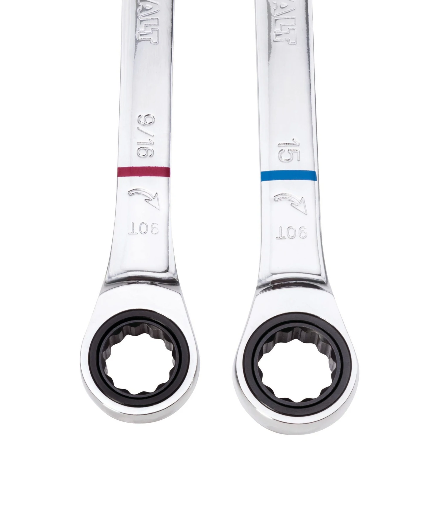 - This 20 piece ratcheting wrench set includes the following metric and SAE sizes: 6, 8, 10, 12, 13, 14, 15, 16, 17, 18 mm and 1/4, 5/16, 11/32, 3/8, 7/16, 1/2, 9/16, 5/8, 11/16 and 3/4-inch