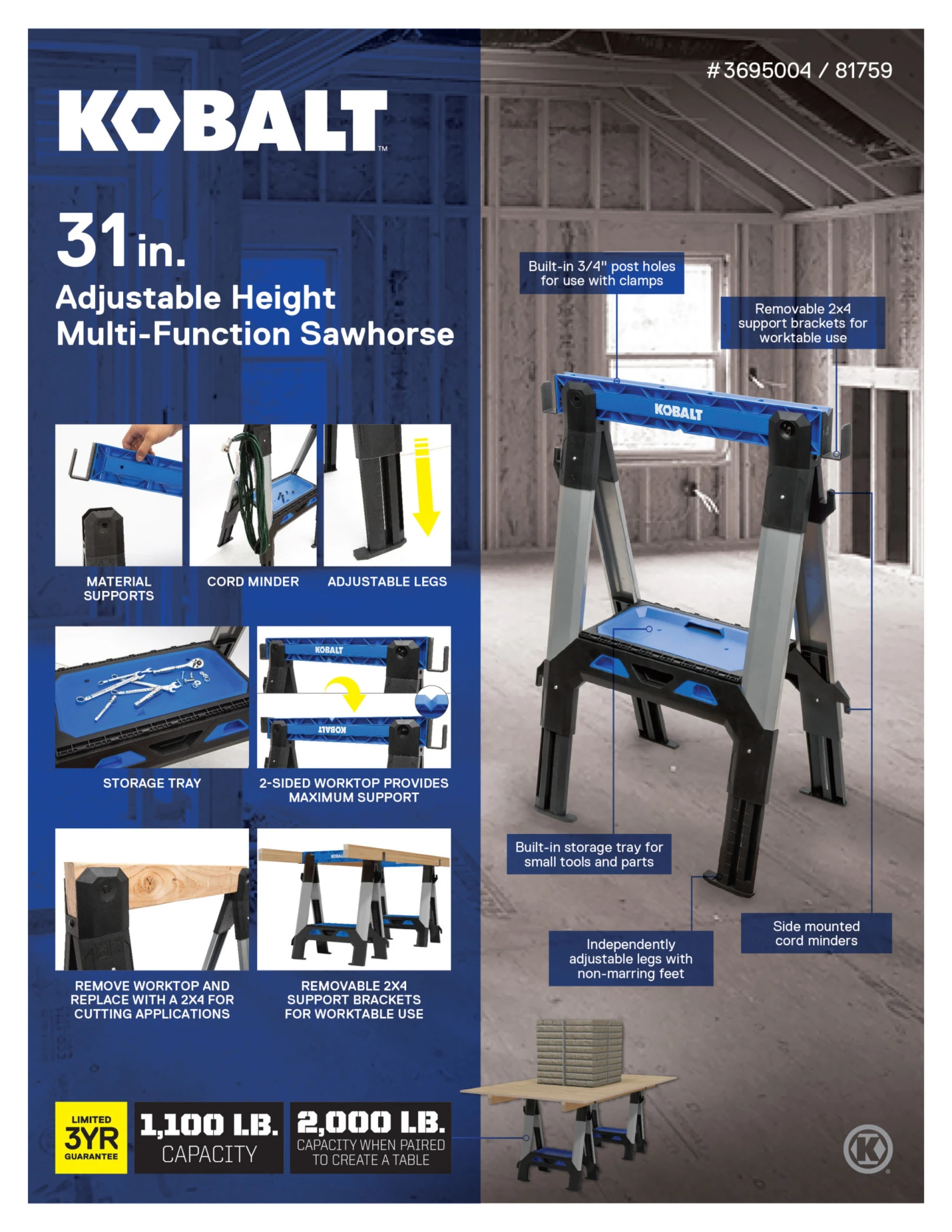 Kobalt’s 31-inch 4-in-1 flip-style worktop sawhorse has a removable support with a built-in V-notch on one side and lateral V-notch on the other for working on round objects as well as built-in clamping slots for toggle clamps. While in the lowest height setting, each saw horse has 1,100-lb load capacity, and can be paired to create a table-top workspace with a weight capacity of 2,200 pounds.