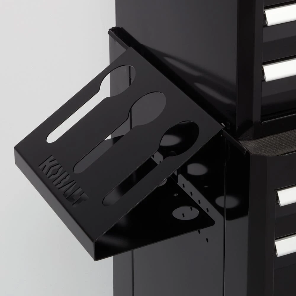 This power tool holder can hold up to three tools, such as power drills. It can hang on the side of a tool cabinet or be placed inside a drawer.