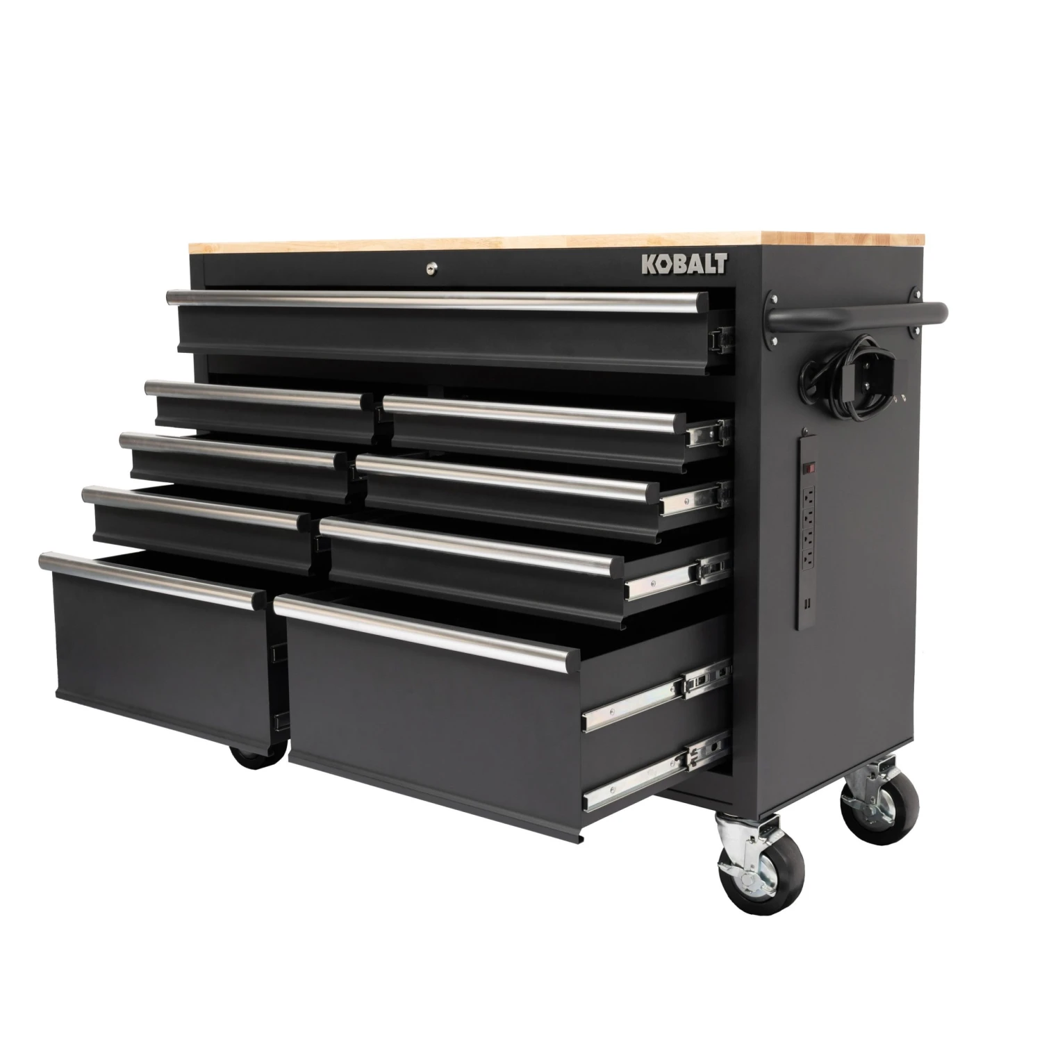 The Kobalt 46 in. 9 drawer mobile workbench is great for storing and organizing all your tools and hardware. The unit is made from high grade all welded steel construction with a tough, rust-resistant powder coat finish. 9 Drawers are soft-close full-extension and glide effortlessly on ball-bearing slides that can support up to 100 lbs. solid wood top with protective coating provides great work surface. You can charge your electronics and power tools even when the chest is locked via the integrated power strip with 4-outlets and 2-USB ports. An ergonomic handle and 5 in. x 2 in. casters allow you to easily move your cabinet around your workspace. Total weight capacity of the unit is 1,200lbs.
